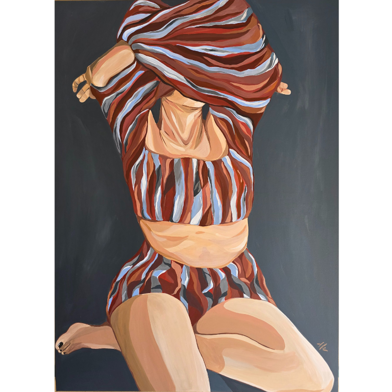 Descrizione: L’opera rappresenta un momento intimo e quotidiano cioè quello del vestirsi e del denudarsi. C’è un attimo che è un vero e proprio spazio sospeso in cui non si distinguono le due azioni pertanto costituisce il preludio di due possibili esiti: il ritorno ad uno stato di vulnerabilità e autenticità mediante l’abbandono delle vesti e quindi del ruolo ricoperto precedentemente oppure, al contrario, il ritorno ad uno stato cosciente attraverso la vestizione e dunque l’assunzione di una forma coerente specifica di contesto e di posizione. Quell’attimo di sospensione del gesto quotidiano e comune del soggetto viene immortalato rappresentando la più pura autenticità dell’essere, la sua vulnerabilità e insieme una serena compostezza nonostante la sensualità del corpo e l’intimità dell’atmosfera che si percepisce.