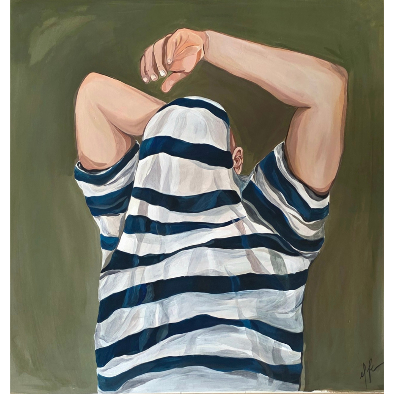 Descrizione: C’è un momento molto intimo e suggestivo in cui si abbandona il proprio ruolo, la “maschera” e si entra nuovamente in una dimensione di abbandono e autenticità, ma questo accade anche all’inverso. Questo momento sospeso che a tutti è a tutti gli effetti uno “spazio” sospeso è rappresentato visivamente dall’atto di spogliarsi e vestirsi, azioni contrapposte che in un attimo preciso risultano indistinguibili. Precisamente in quell’attimo la persona in un gesto intimo ma innocente e quotidiano si mostra, pur nascosta, nella sua essenza più pura.