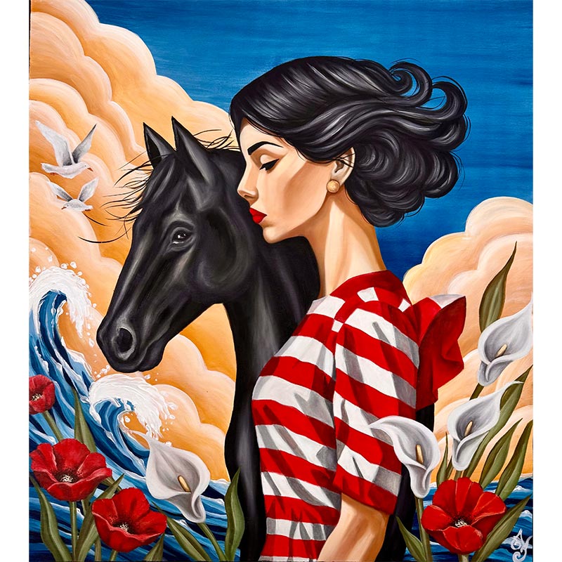 In questo dipinto il cavallo rappresenta empatia, in un incontro tra forza e grazia.
