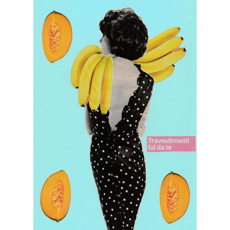 Descrizione: Quest’opera è stata realizzata a fine estate del 2024 e segna l’inizio di un nuovo percorso artistico. In quel periodo mi sono dovuta isolare a causa di violente crisi vertiginose che mi costringevano a stare a riposo. Ho dovuto voltare le spalle ai miei impegni, alle mie abitudini. Fino a quel momento ritagliavo ed incollavo soprattutto pesci e frutta che associavo a qualche parola. Poi è nata l’esigenza di scegliere modelle per i miei collage che al mio posto avrebbero fatto cose, si sarebbero vestite, acconciate. In quest’opera, la modella ritagliata da una rivista vintage, sfoggia banane come fossero parte del vestito. Gli spicchi di melone simboleggiano l’estate trascorsa e incorniciano l’immagine. Lo sfondo celeste risponde al bisogno di ritrovare serenità.