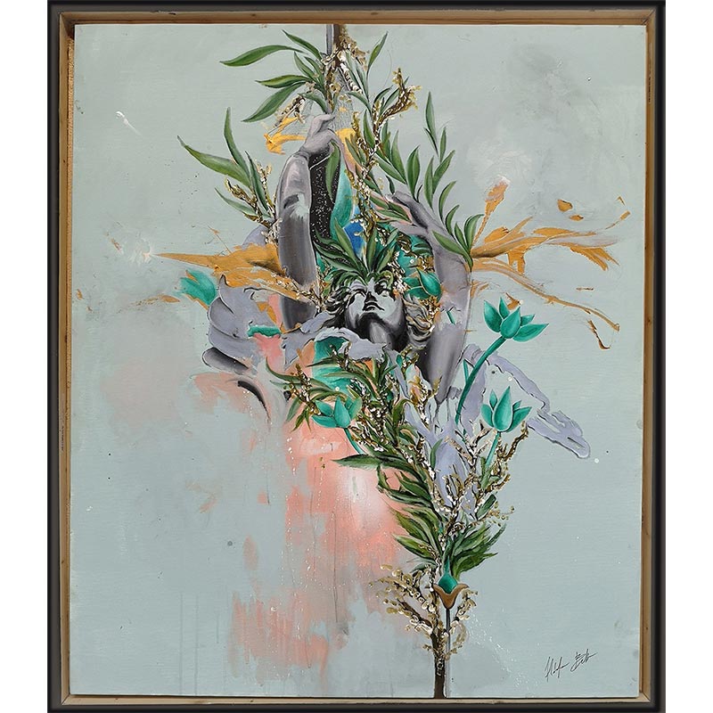 Descrizione: Traendo spunto dalla Nike di bronzo del Parco della Rimembranza, il punto panoramico più alto della città di Torino, quest’opera è stata sublimata anche in un’opera su carta di dimensioni più ridotte, intitolata Orama, che presenta una composizione simile. Fotosintesi, un termine che affonda le sue radici nell’antico concetto filosofico greco di “Ph.y.sis”, che esplora l’enigmatico processo attraverso il quale le piante trasformano la luce solare in nutrimento. Natura, che rimane l’assioma fondamentale alla base di ogni teorema. Orama è un termine che deriva dalla chimica più intima, quindi l’ho immaginato in relazione al mio lavoro visto nel suo insieme, osservato da un punto di vista generico e non in relazione a una o più opere specifiche della mia produzione. Diacronico, d’altra parte, indica la mia tendenza alla ricerca, il modo in cui vario i miei processi e i collegamenti intermedi tra dipinti, sculture, opere su carta, video. Essere critico sulle mie percezioni, permette a questo metodo diacronico di catalogazione attraverso i fattori temporali di trasudare riferimenti a una serie indefinita di condizioni psichiche che sperimento fin da bambino con il gioco, con il modo in cui queste condizioni si manifestano ciclicamente nelle loro relazioni e interoperatività, simili a ciò che collega vegetali, Sole ed energia vitale.