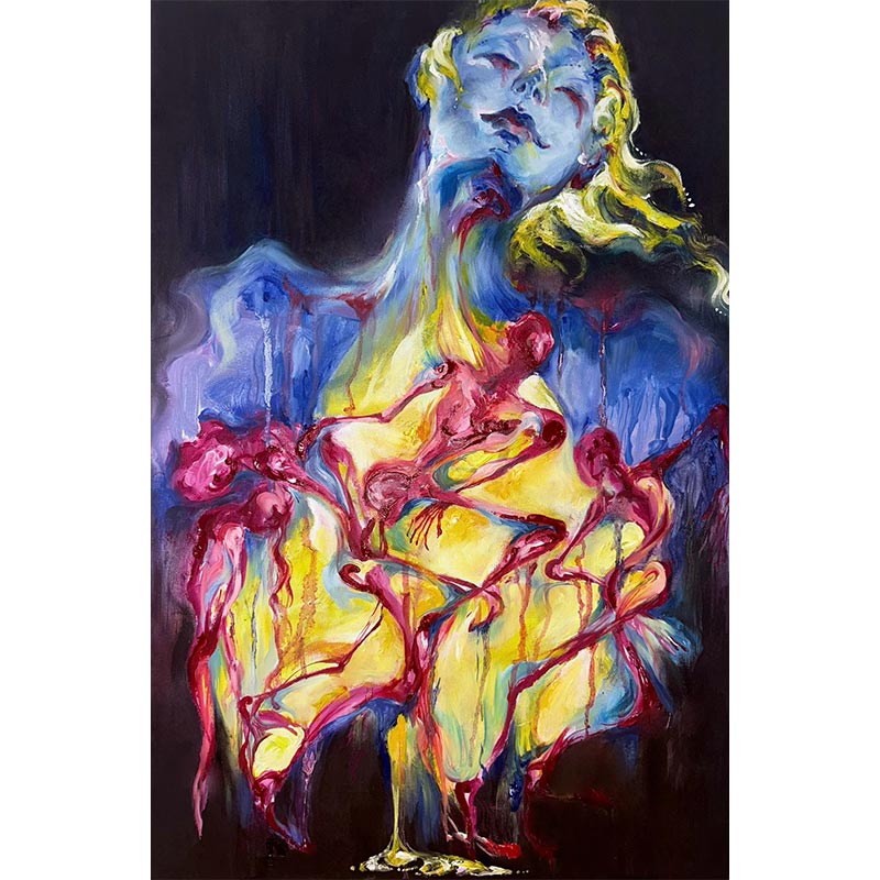 Descrizione: Upon the canvas of【Resonant field】, I explore how the body’s rhythm shatters barriers within and between us. Individuals merge into a fluid, breathing whole—an energy field that refutes the illusion of separation.