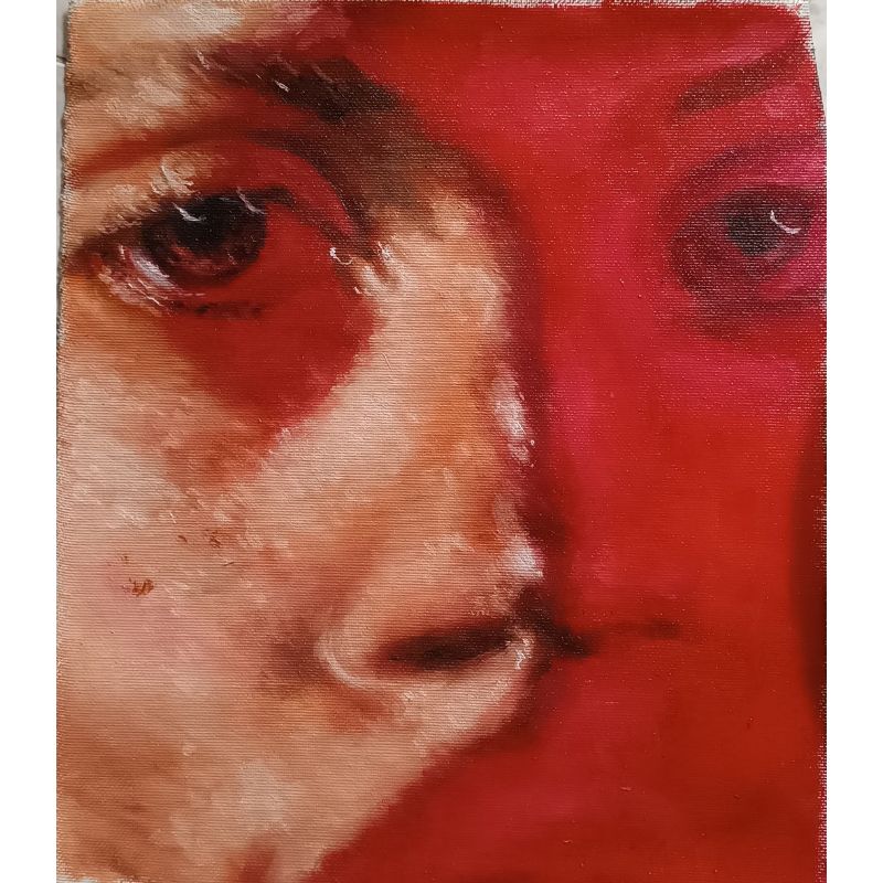 Descrizione: Un volto che guarda e si guarda. Il percorso della sua evoluzione è conflittuale, immerso in rosso, travolto da emozioni forti, dolore o rabbia, ma anche passione e desiderio di rinascita.