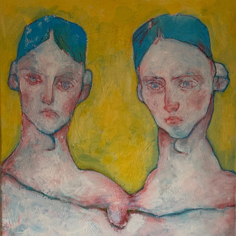Descrizione: Two mirrored figures are bound by an invisible connection, suggesting intimacy, dependence, and emotional tension. The work gives form to the fragile line between closeness and separation.