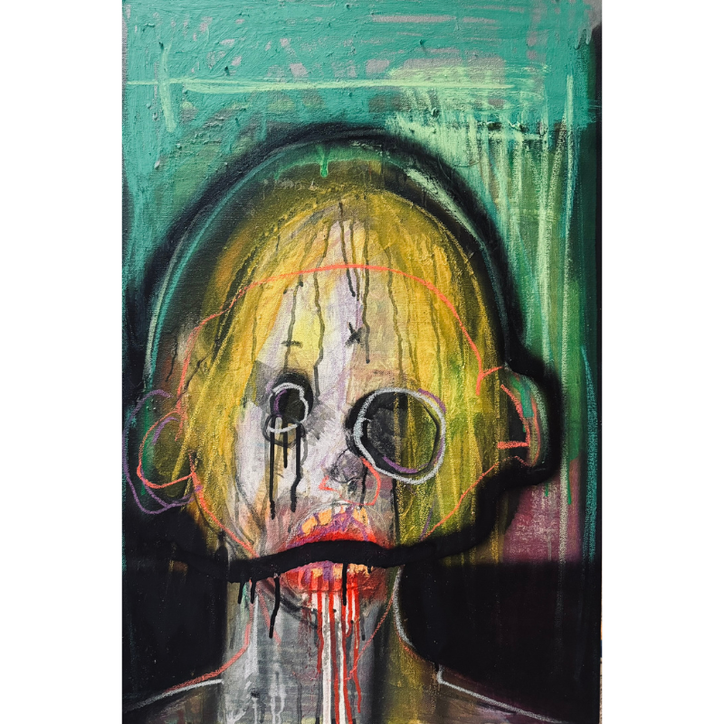Descrizione: A face suspended in a toxic stillness. The figure confronts the viewer with hollow, circular eyes – voids rather than organs – dripping with a dense, black residue that reads as both decay and suppressed emotion. The mouth is violently sealed by a dark horizontal stroke, a gesture that feels imposed rather than chosen, while red paint bleeds downward like an internal rupture made visible. Acid greens and corroded yellows dominate the surface, evoking industrial erosion and psychological contamination. The background does not offer space or relief; it presses forward, enclosing the head in a suffocating atmosphere. Neon-like outlines flicker around the skull, suggesting instability, as if the identity of the subject were vibrating or disintegrating at the edges. “Sick” is not only a condition of the body but of perception. The work inhabits a threshold between physical illness and existential fracture – where silence, repression, and exposure collapse into one distorted presence.