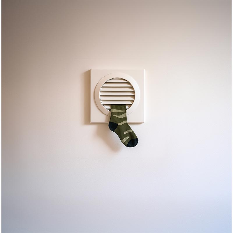 This installation incorporates fragments of military clothing into domestic air ventilation systems, transforming them into symbolic portals that circulate the invisible presence of conflict within everyday life.