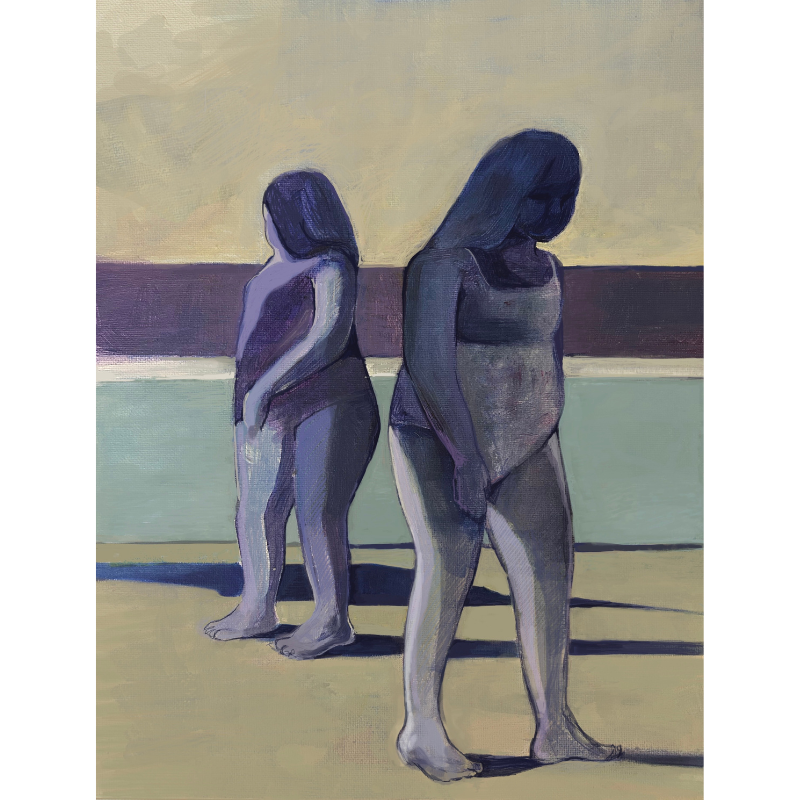 Descrizione: Le due bambine protagoniste di questo ritratto indossano costumi da bagno semplici e sono rappresentate con toni freddi (blu, viola) alla fine di una giornata in piscina, quando il sole sta ormai per tramontare e le loro ombre si stagliano lunghe sulla pavimentazione. È il momento in cui, dopo aver condiviso un lungo pomeriggio di gioco e tuffi, si allontanano emotivamente: ognuna di loro è da sola, anche se le pennellate, le forme e i colori continuano a suggerire il precedente legame.