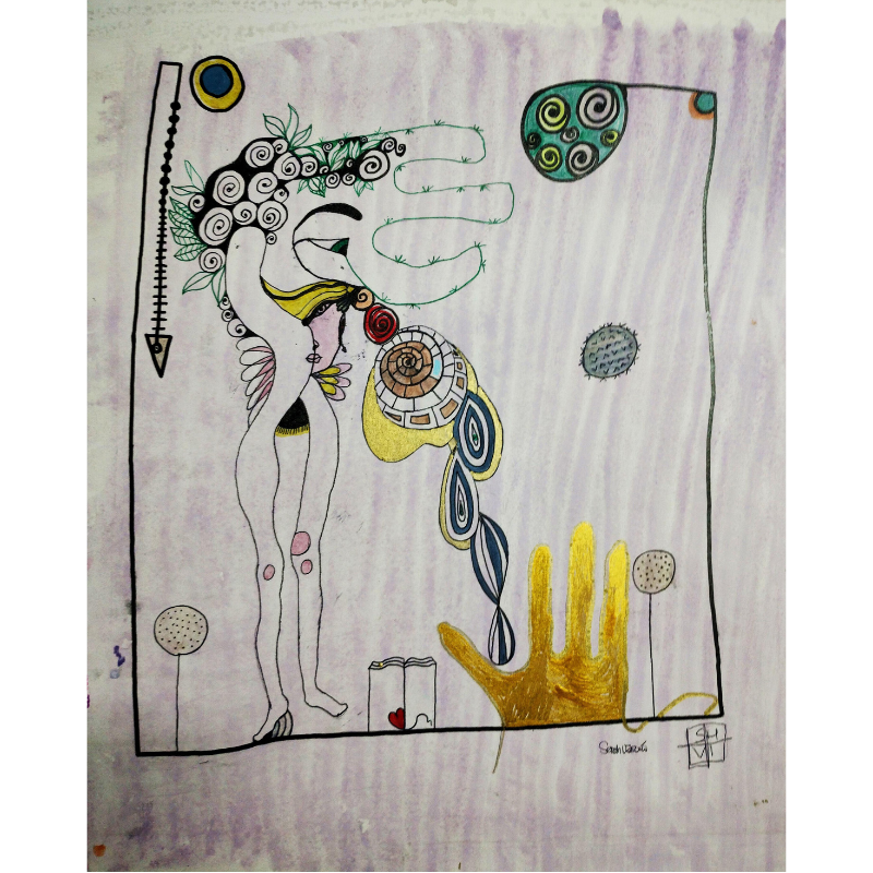 Descrizione: La mente che cerca una connessione con la natura. Una narrazione densa e simbolica, dove il colore interviene a sottolineare elementi chiave, come quello floreale che corona la figura principale. Le forme spiraliformi richiamano la crescita, l’evoluzione, ma anche il labirinto del pensiero. La mano dorata con quattro dita che spunta dal basso e del piccolo libro con il cuore, trasforma l’opera in una sorta di esultanza laica. La mano aperta è un simbolo universale di accoglienza e protezione, mentre l’oro eleva la composizione a una dimensione quasi sacrale o alchemica.