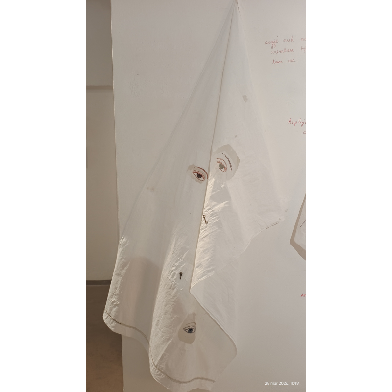 Descrizione: L’opera e stata confezionata su un telo usato per asciugare il corpo, sono inserite quattro occhi ricamati su supporto perforato per mantenere lo sguardo sulla trasparenza e la fragilità del trama. Il tessuto e stato rammentato più volte in modo esasperato da donne che hanno sacrificato la vita per un ideale. E un lavoro che vuole onorare il sacrificio