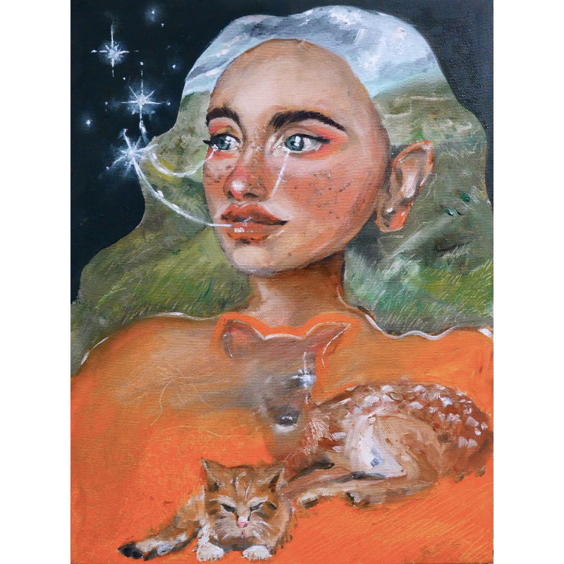 Descrizione: Tessuta sullo sfondo di un cielo notturno, la figura incarna un ricordo di una vita lontana, un prato di un pallido verde con un cielo dal tempo indefinito, racchiusi dalla sua folta chioma mossa. Un pianto ancestrale che collega cielo e terra, che unisce il buio con una luce di un arancio intenso dove si stagliano le figure di due animali sacri, puri, magici, due “famiglio” quindi, che governano misticamente la porta dei ricordi.