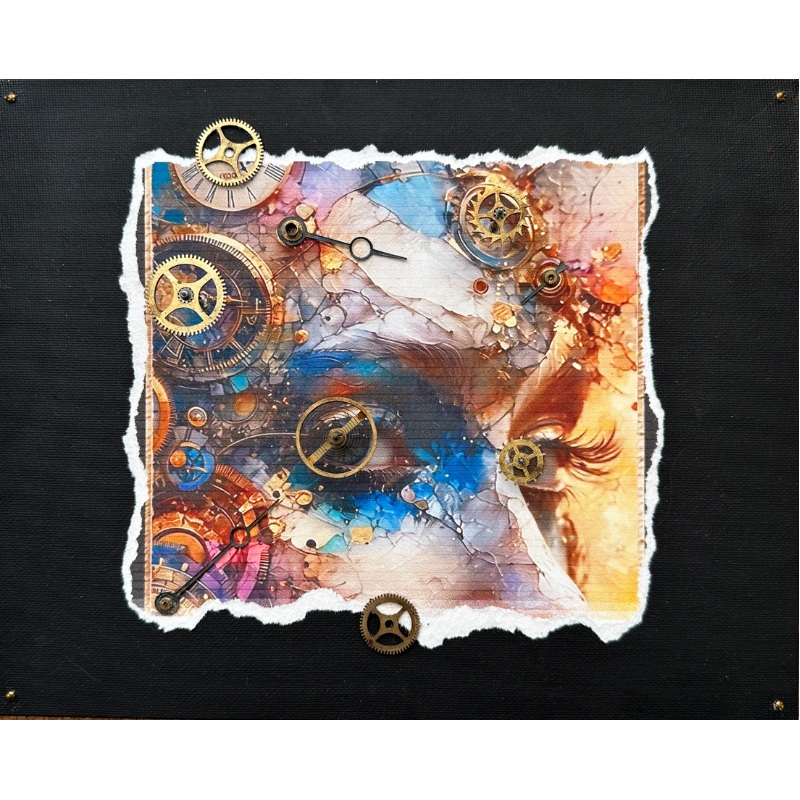 Descrizione: Mixed media comprised of a fractured painting of a face and gears and hands from an old clock. These pieces were selected to represent healing through time and although fractures never fully mend, time does help move forward. THis represents my personal journeys after losing my teenage son and most recently my husband of 46 years.