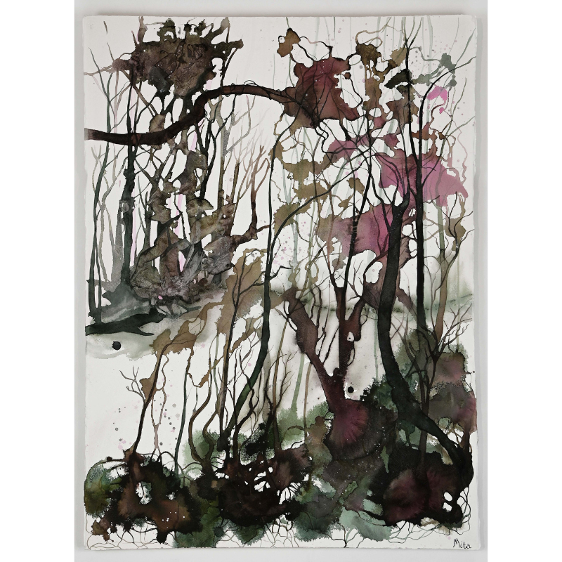 Descrizione: Un sottobosco si mostra impudicamente: steli sottili, ombre vegetali, germinazioni improvvise. I verdi scuri e i bruni profondi filtrano dalla terra, i rosa umidi affiorano come linfe, muffe gentili si abbarbicano alle radici laddove queste si denudano. È la vita minuta del bosco, che prospera lontano dalla luce piena e si nutre di acqua trattenuta, pertugi fertili.