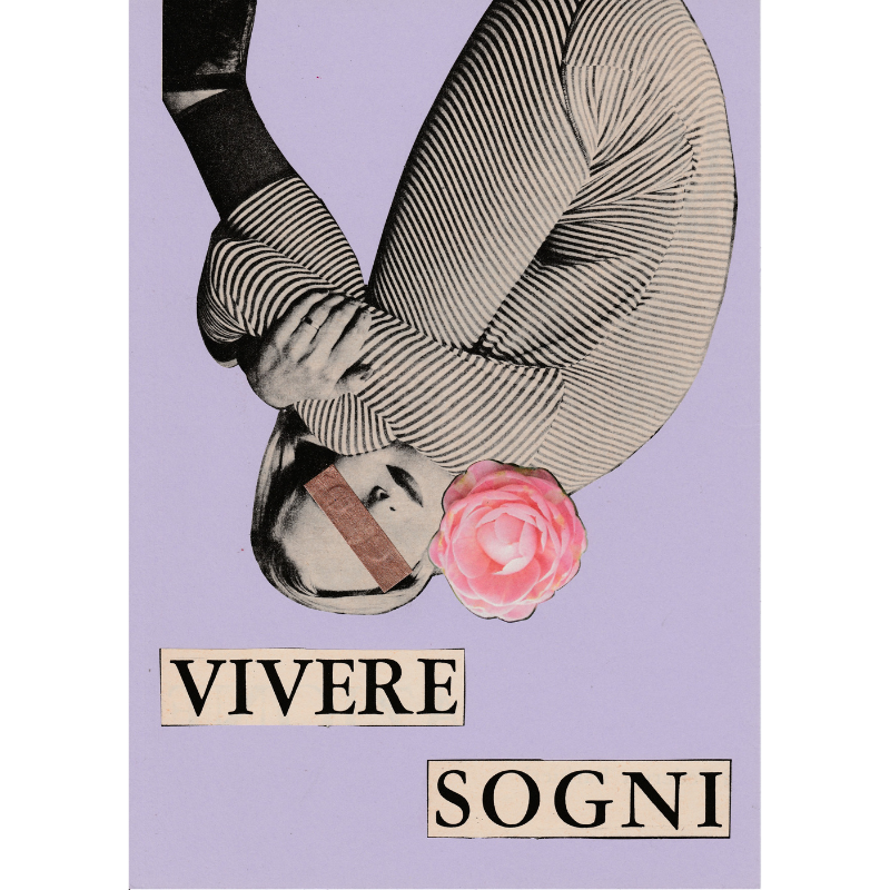 Descrizione: Una modella ritagliata da una rivista vintage con un pigiama a righe. È rannicchiata in posizione fetale, ho scelto di capovolgerla e appenderla come fosse una figura circense. Gli occhi bendati da uno sticker smaltato d’oro come i buoni sogni e una rosa che sostituisce delicatamente il cuscino.